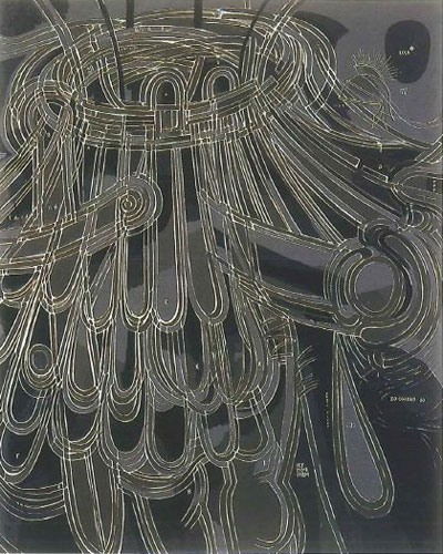 He was a Medical school student, but moved to Lisbon, to study at the Fine Arts School of Lisbon between 1963 and 68. His first exhibition was held in 1968 at the Quadrante gallery, in a period when he exercised a Pop Art-influenced figurativism, as well as illustration and comics-related techniques and other "marginal" typologies of figuration. ¶ Between 1971 and 74, as a student at London's Royal College of Art, he achieved remarkable watercolour technical skills. He returned in 1974 to Portugal and exhibits works at Gulbenkian that seem to prolong his previous figurative and chromatic options, and even choice of humour, although clearly revealing a penchant for scandalous topics such as sexuality, and mixing literary allusions and commentaries on his contemporary state of affairs, whether political or artistic. In the late 70s, he moved to Porto, where he became a teacher at the Fine Arts School of Porto. ¶ The 80s are a turning point for Batarda. To begin with, his chromatic palette becomes much more grave, densified, and his network of source material becomes larger, embracing the whole of the History of Art, brought about whether by recurrent formal archetypes or other quite erudite details. The commentary aspect becomes more ciphered, less explicit. ¶ These new paintings, at a more emotional, immediate level, have a tendency to suggest a certain vortex effect, as if in a whirlwind, an abyss of sorts - sometimes through a quite literal representation. ¶ During the 90s, the colours return to their rightful place in Batarda's painting. They displace the blacks, and they seem to open from within, whereby form strengthens its dynamic dimension. The 1997 works have the brand of a strong tendency towards diversification, by the resurfacing of elements from earlier phases of the author. ¶ Since 2000, his painting has entered yet a new phase, the main characteristic of which is a clear distinction between form and content, due to the high contrast of two uniform colours. These are works that bring closely together a certain degree of formal contention and the author's ability for an infinite, good-humoured multiplication of suggestions, which is one of his work's main features.